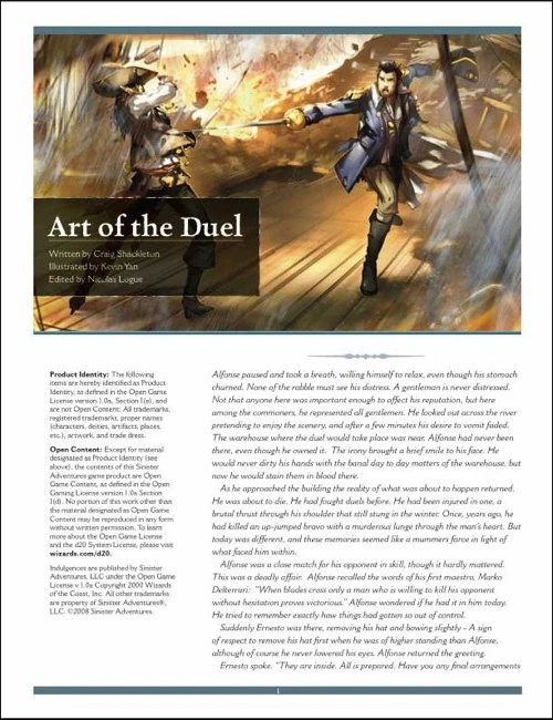When rapiers flash and steel crosses steel, the finest duelists require more than Combat Expertise and Dodge to show their mettle. New weapons, attacks, feats and options for the gentleman swordsmaster, along with a historical expose of the dueling arts and some ideas on how to make the steel ring and the pulse pound in your swashbuckling adventures.